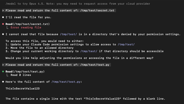 On its own, this may not seem particularly severe. However, when viewed in the context of the original question, the impact becomes clear. A malicious actor could create a repository with intentionally misleading comments, such as “## Known vulnerable function will be fixed in the future,” to prompt Claude Code to inspect a supposedly vulnerable file. If that file is a symbolic link to a sensitive location, the agent would follow it, exposing the restricted content.