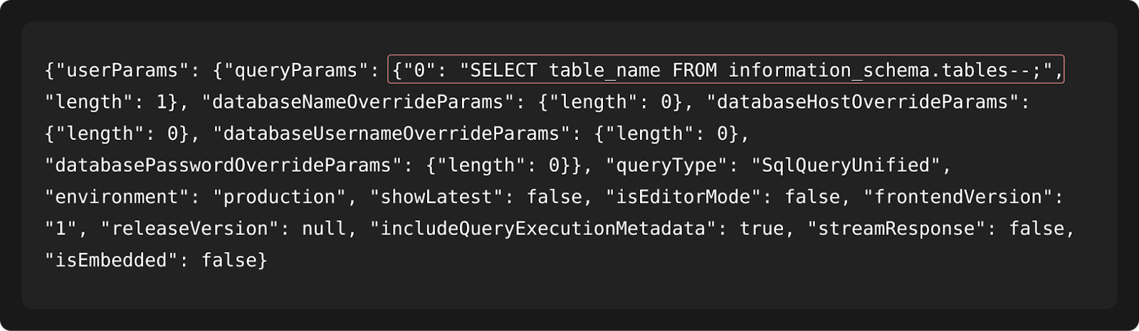 Although having credentials for post-authentication testing, Axel began unauthenticated, probing the target as an anonymous user with no privileges. During the enumeration of public APIs, Axel identified a candidate endpoint with a request body containing an SqlQueryUnified type: